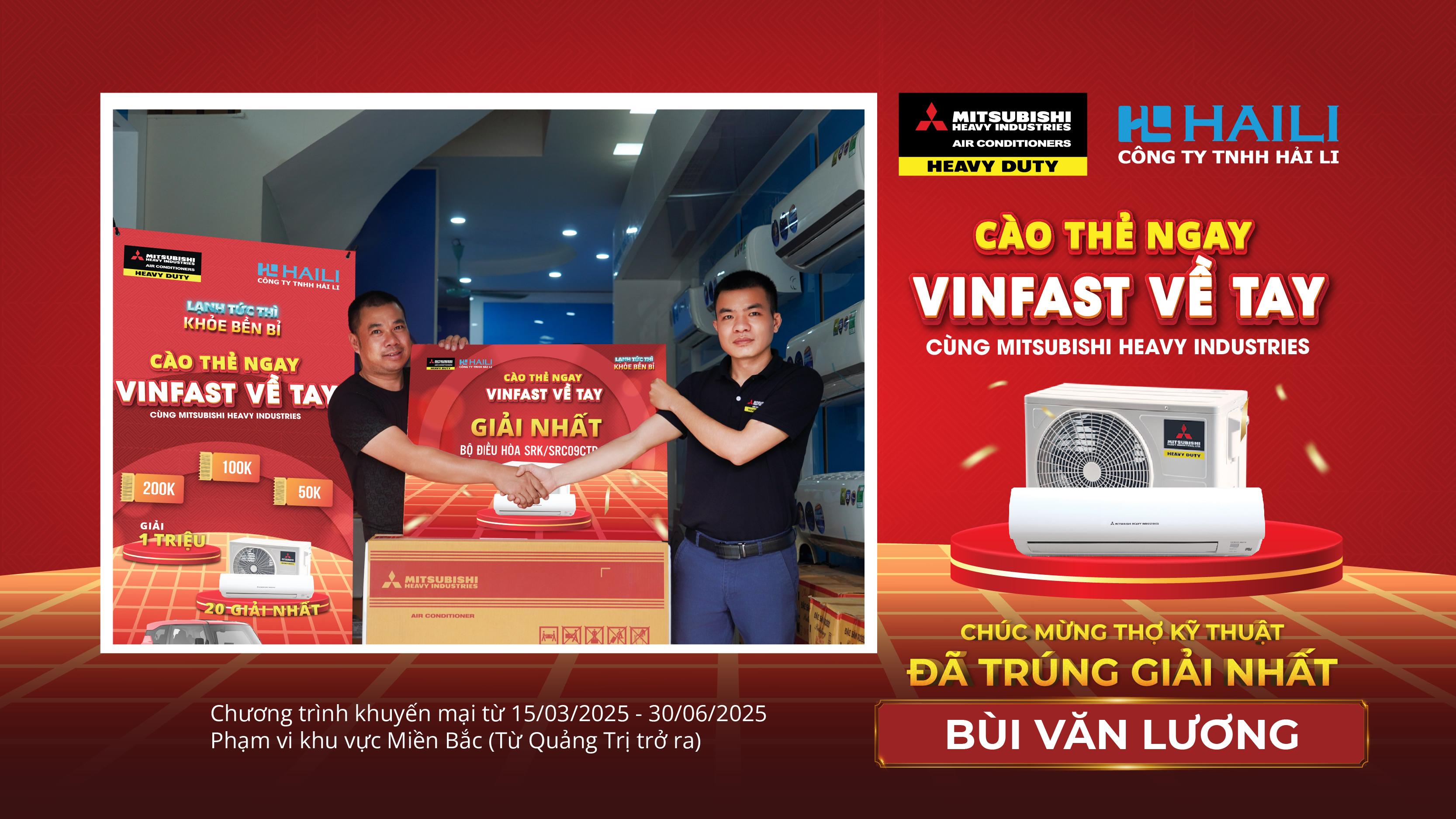 Xin chúc mừng Anh Bùi Văn Lương - Thợ kỹ thuật đang sinh sống và làm việc tại Long Biên, Hà Nội là chủ nhân may mắn tiếp theo của GIẢI NHẤT - ĐIỀU HÒA MITSUBISHI HEAVY INDUSTRIES SRK/SRC09CTR-S5.