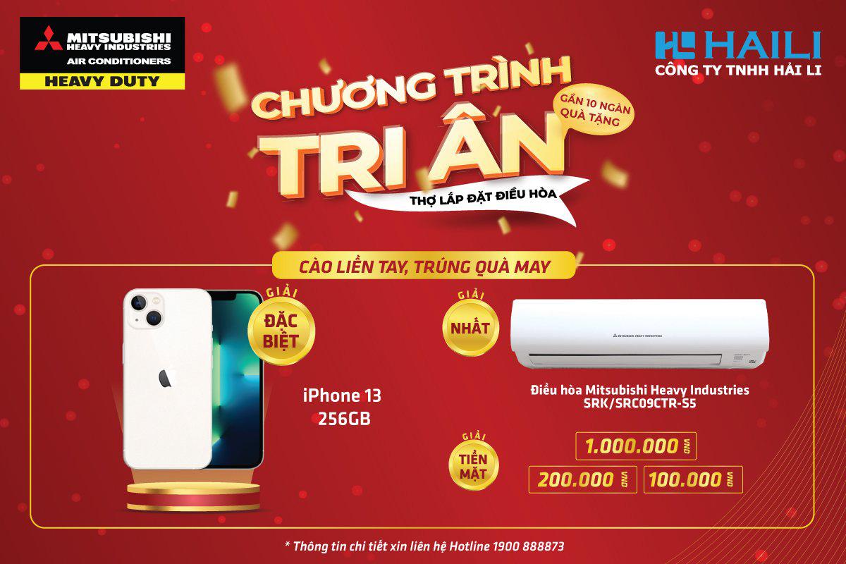 Mitsubishi Heavy Industries (Công ty TNHH Hải Li) trân trọng cảm ơn Quý Khách hàng đã luôn tin tưởng và hợp tác cùng thương hiệu điều hòa của chúng tôi trong thời gian qua. Thay lời cảm ơn, Mitsubishi Heavy Industries (Công ty TNHH Hải Li) xin gửi tới Quý Khách hàng chương trình “MUA ĐIỀU HOÀ, TRÚNG XE GA” như sau: